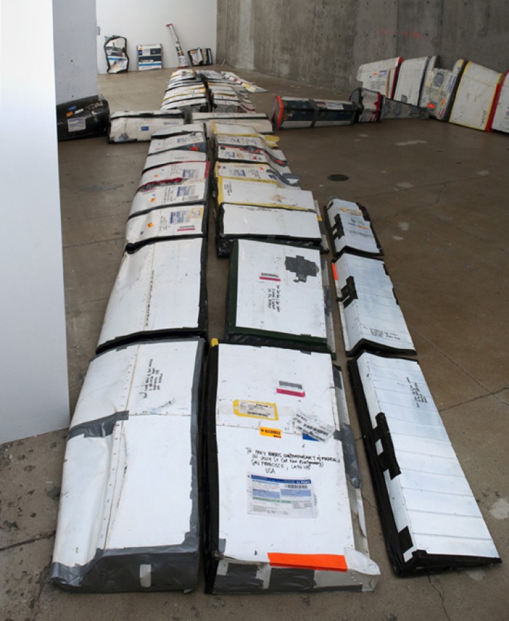 Check out this awesome pair. This work is called Par Avion, 2011. The body of a a Cessna 172, was deconstructed by cutting it into small pieces and applying postage stamps directly to the surface of each article. The parcels were then sent by air freight to Gallery Frey Norris, San Francisco. Par Avion or Airmail, is French and the phrase indicates a letter should be sent by air. Healy and Cordeiro think that it's apt that such postal etiquette should be placed upon the small parcels that once comprised a vehicle of air travel.